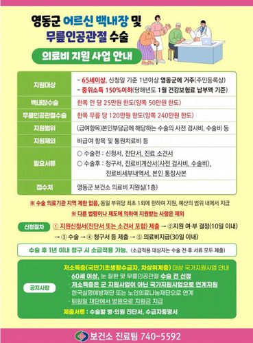 영동군은 2024년부터 군민 1천122명에게 7억5천800만원을 지원해 백내장(867명)과 무릎관절(255명) 수술을 주선했다고 15일 밝혔다.