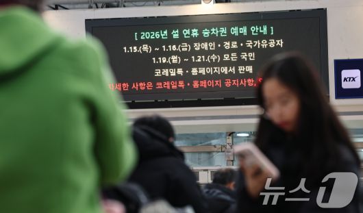 (서울=뉴스1) 김도우 기자 = 한국철도공사(코레일)가 15일부터 '2026년 설 열차 승차권'예매를 시행한다. 교통약자 사전 예매는 15일과 16일 이틀간 오전 9시부터 오후 3시까지, 19일부터 21일까지 사흘간 오전 7시부터 오후 1시까지는 경로·장애인·국가유공자(교통지원 대상)를 포함한 모든 국민을 대상으로 예매가 진행된다. 15일 서울 중구 서울역 대합실 알림판에 설 열차 승차권 예매 안내문이 송출되고 있다. 2026.1.15/뉴스1