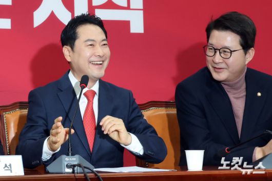 국민의힘 장동혁 대표와 신동욱 최고위원이 15일 서울 여의도 국회에서 열린 최고위원회의에서 밝은 표정을 짓고 있다.