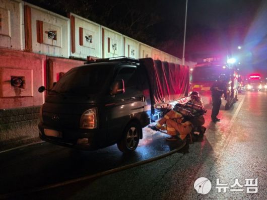 트럭 엔진 부분에서 발생한 화재는 운전자가 소화기로 자체진화를 시도한 뒤 신고 후 경찰 공동대응으로 진화를 완료했다.
