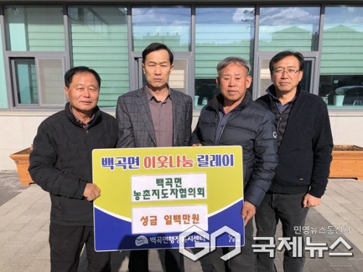 이세웅 백곡면장은 "농촌지도자들의 따뜻한 나눔에 진심으로 감사드리며 앞으로의 활동을 항상 응원하겠다"며 "기탁해 주신 성금은 도움이 꼭 필요한 이웃들에게 소중히 전달하겠다"고 말했다.