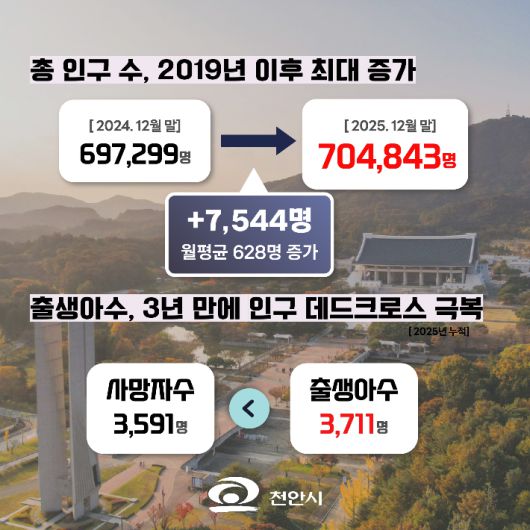 천안시에 따르면 지난해 12월 말 기준 천안시 총인구(외국인 포함)는 지난해 같은 기간보다 7544명(1.1%) 늘어난 70만 4843명으로 집계됐다. 이는 2019년 이후 연간 증가치 중 최대 증가한 수치로 분석된다.