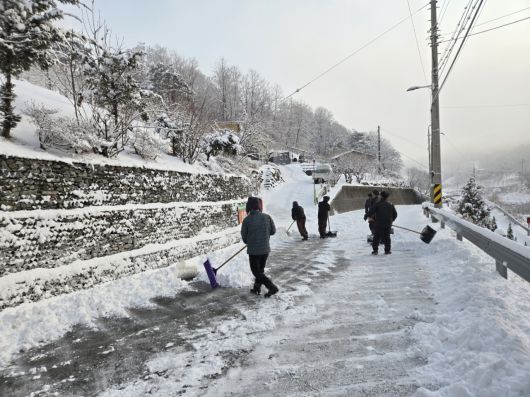 산지가 많은 지역 특성상 중장비 투입이 어려운 가운데, 주민과 행정이 힘을 모아 주요 도로와 마을 안길 제설을 신속히 완료했다.