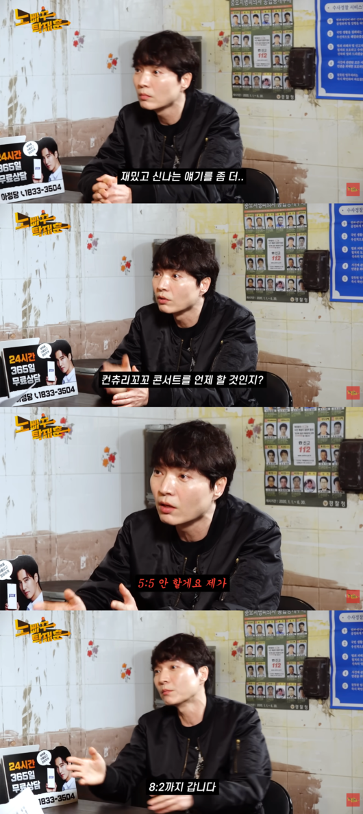 그러면서 신정환은 “컨츄리꼬꼬 콘서트를 언제 할 것인지? 단독만 하시지 말고, 일단 제가 5:5 안할게요. 제가 좀 더 드릴게요. 8:2까지 갑니다”라고 러브콜을 보냈고, 탁재훈은 “자세 좋은데요? 이거 조금 말만 잘하면 그냥도 하겠다”고 솔깃한 모습을 보여 웃음을 안겼다.