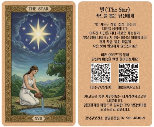 구는 관내 신한은행 금융 창구에 큐알코드 기반 타로카드 형태의 마음건강검진 시스템을 도입해 누구나 마음 상태를 점검할 수 있도록 했다. 비치된 타로카드 뒷면의 큐알코드를 통해 마음건강검진을 받고 필요한 경우 상담도 받을 수 있다.