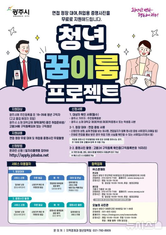 이 사업은 광주시에 거주하거나 시 소재 대학에 재·휴학 중인 청년 구직자를 대상으로 하며 면접 정장 대여와 증명사진 촬영 비용을 전액 지원하는 것이 주요 내용이다.