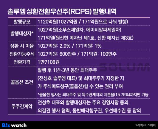 아울러 솔루엠은 콜옵션뿐만 아니라 RCPS 발행대상자와 주주 간 계약을 맺어 의결권 행사 협력, 주요 경영 사항 동의 등도 합의했다. 이에 따라 RCPS 발행대상자가 보유하고 있는 우선주 지분율 12.77%는 현재 전성호 대표 등 최대주주 및 특수관계자와 공동보유자로 묶여 있는 상태다. 이들이 전환권을 행사하면 12.77%는 고스란히 전성호 대표의 우호 지분으로 남는다.