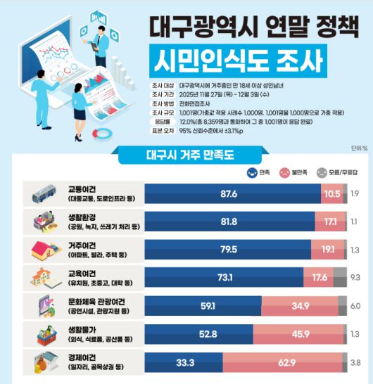 15일 대구시가 발표한 시민 인식도 조사 결과에 따르면 시민들은 교통, 생활 환경, 거주여건에 대해서는 80% 안팎의 만족도를 보인 반면 경제여건에 대해서는 62.9%가 불만족한다고 답했다. 경제여건에 만족한다는 응답은 33.3%에 불과했다.