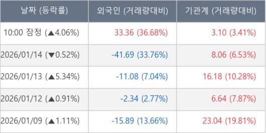 [서울=뉴스핌] 로보뉴스 = 15일 10시 15분 현재 이수페타시스(007660)는 전일 대비 4.06% (현재가 120,400원) 상승했고, 기관이 최근 5일 연속 순매수(누적 57.03만 주, 잠정) 행진을 하고 있다.