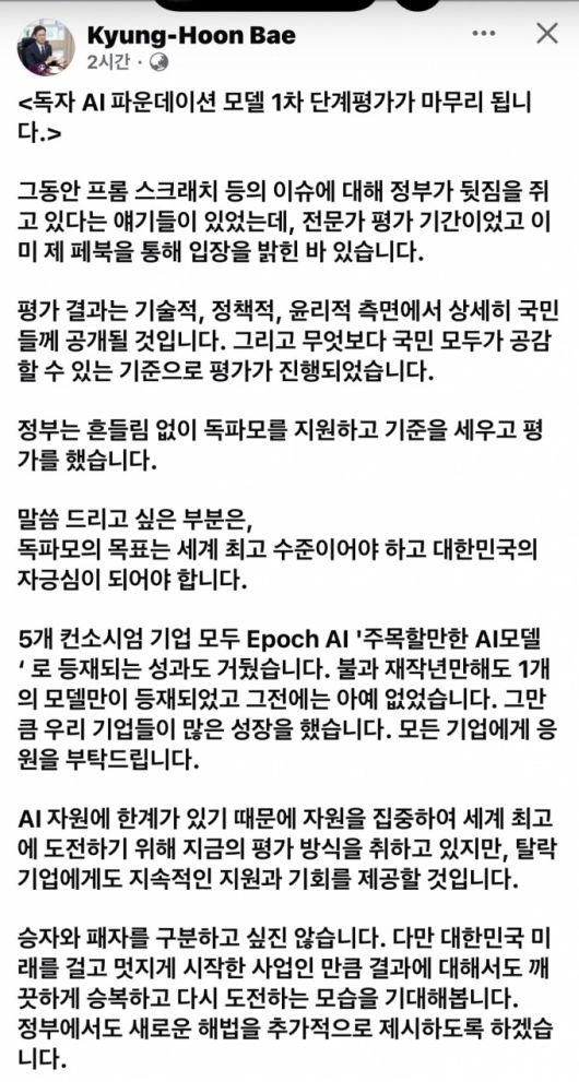 배경훈 과학기술정보통신부 장관 겸 부총리가 SNS(소셜미디어)에 독자 AI(인공지능) 파운데이션 모델 1차 단계평가를 앞두고 "깨끗하게 승복해달라"고 당부했다.