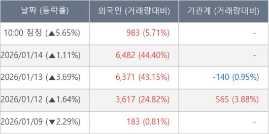 [서울=뉴스핌] 로보뉴스 = 15일 10시 15분 현재 대덕전자1우(35320K)는 전일 대비 5.65% (현재가 14,400원) 상승했고, 외국인이 최근 6일 연속 순매수(누적 19,354주, 잠정) 행진을 하고 있다.