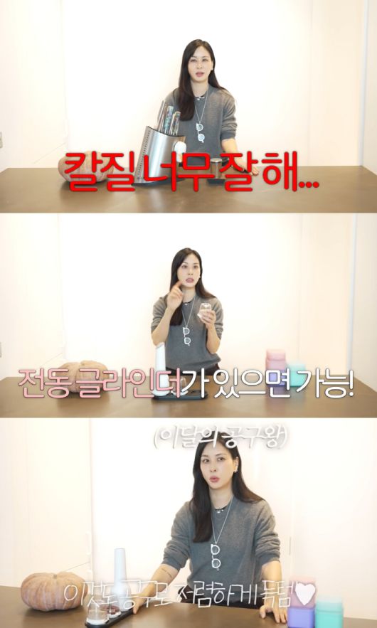 고소영은 "칼이 무디면 너무 힘들다. 그래서 저는 좀 가격대가 나가지만 전문 칼갈이 장비를 구매했다"라며 칼을 가는 시연을 보여주기도 했다.