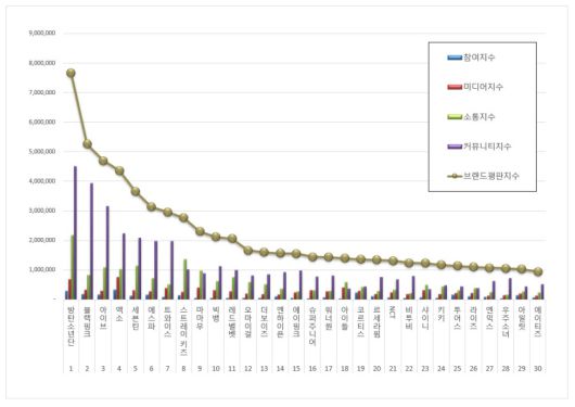 아이돌그룹 브랜드평판은 보이그룹과 걸그룹을 통합한 브랜드 카테고리 분석으로, 아이돌그룹 브랜드에 대한 소비자들의 참여지수, 미디어지수, 소통지수, 커뮤니티지수를 측정해 브랜드평판지수를 분석했다.