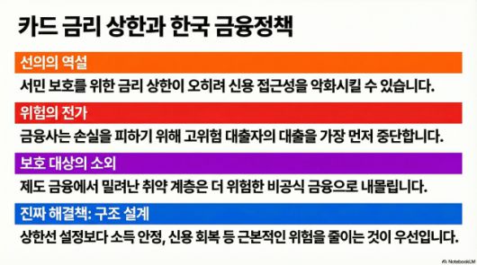 금융은 도덕의 언어만으로 작동하지 않는다. 위험을 가격으로 반영하는 시스템이다. 금리 상한은 위험을 제거하는 장치가 아니라, 위험을 시장 밖으로 밀어내는 선택이 될 수 있다. 실제로 금리 규제가 강화되면 가장 먼저 신용 접근이 제한되는 계층은 고위험 차주들이다. 카드사들은 손실을 감수하지 않기 위해 대출 자체를 줄이게 된다.