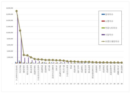 제약 상장기업 브랜드평판지수는 브랜드에 대한 소비자들의 활동 빅데이터를 참여가치, 소통가치, 소셜가치, 시장가치, 재무가치로 나눠 분석하며, 이번 브랜드평판조사에서는 참여지수, 소통지수, 커뮤니티지수, 시장지수를 활용했다.