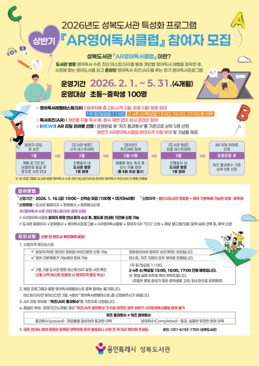 2026년 'AR(Accelerated Reader)영어독서클럽' 상반기 참여자 100명을 모집한다/[사진=용인시][경기 용인=팍스경제TV] 용인특례시 성복도서관은 오는 16일부터 2026년 'AR(Accelerated Reader)영어독서클럽' 상반기 참여자 100명을 모집한다고 15일 밝혔습니다.