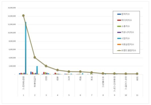 2위 CJ대한통운 브랜드는 참여지수 665,212 미디어지수 573,170 소통지수 302,311 커뮤니티지수 378,238 시장지수 2,033,927 사회공헌지수 148,356이 되면서 브랜드평판지수 4,101,215로 분석됐다. 지난 12월 브랜드평판지수 4,113,085와 비교하면 0.29% 하락했다.