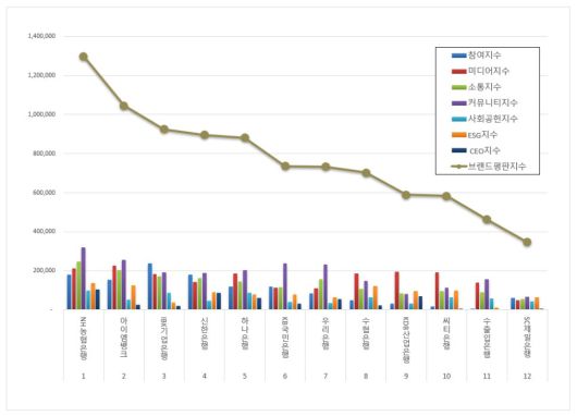은행 브랜드평판 1위를 기록한 NH농협은행 브랜드는 참여지수 179,682 미디어지수 211,265 소통지수 247,970 커뮤니티지수 319,550 사회공헌지수 97,368 ESG지수 136,701 CEO지수 105,467이 되면서 브랜드평판지수 1,298,004로 분석됐다. 지난 12월 브랜드평판지수 2,103,209와 비교하면 38.28% 하락했다.