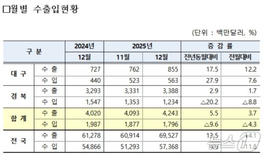 대구의 작년 12월 수출액은 8억 5500만 달러로 전년 동월 대비 17.5%, 수입액은 5억 6300만 달러로 27.9% 각각 늘었다.