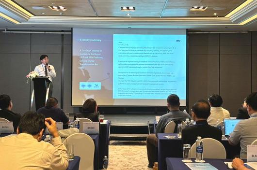 에스와이유 IR 담당자(맨 앞)가 베트남 현지에서 투자자 및 산업계 관계자들에 자사의 플랫폼 서비스를 소개하고 있다. 부산창조경제혁신센터 제공 |