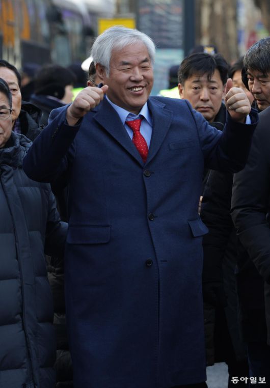 윤석열 전 대통령 탄핵 과정에서 발생한 서울서부지법 난동 사건의 배후로 의심받는 전광훈 목사가 13일 오전 서울 마포구 서울서부지법에 구속적부심 심사를 받기 위해 출두하며 지지자들을 향해 양손을 들고 있다. 변영욱 기자 cut@donga.com |