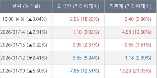 [서울=뉴스핌] 로보뉴스 = 15일 10시 15분 현재 에이피알(278470)은 외국인과 기관이 각각 2.55 만 주, 0.40 만 주 순매수(잠정) 하면서 전일 대비 3.04% (현재가 237,000원) 상승하고 있다.