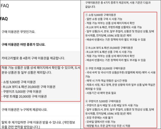 쿠팡은 구매이용권 지급을 하루 앞둔 전날 FAQ 내용을 수정했다. 안내 분량이 크게 늘었다. 쿠팡과 쿠팡이츠 구매이용권에는 ‘일부 상품(도서, 분유, 일부 쥬얼리, 상품권 및 현금성 상품, 담배 유사제품, 전자담배, USIM, 보험 등)은 제외’라는 문장이 추가됐다.