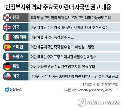 (서울=연합뉴스) 김지헌 기자 = 이란에서 유혈 사태가 이어지고 미국의 공습 가능성이 제기되면서 한국 정부도 현지 상황을 예의주시하며 교민 안전대책을 점검하고 있다.