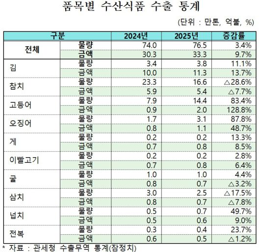 지난해 우리나라 수산식품 수출이 33억 달러를 넘어 역대 최대 실적을 기록했다. 김을 중심으로 고부가가치 품목 수출이 확대되며 물량 증가보다 금액 증가가 두드러진 한 해로 평가된다.