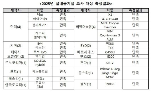 2025년 신차 실내공기질 측정 결과.(국토교통부 제공)뉴스1ⓒ news1 |