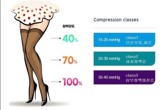 이 둘의 결정적 차이점은 '혈액순환 향상에 초점을 둔 압력 설계'가 이루어진 제품이냐 아니냐의 문제입니다. 하지정맥류 전용 압박스타킹은 다리의 발목(100%), 종아리(70%), 허벅지(40%) 부위에 각각 단계별 압력을 설계하여 제작된 제품입니다. 하지정맥류 예방 혹은 부종 및 피로감 등의 증상 관리 차원에서 착용하는 것이라면 Class 2 (CCL2, 23~32mmHg) 압력의 제품군이 적합합니다.
