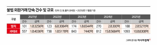 이날 킥오프 회의를 시작으로 매달 국장 주재로 열리는 회의에서 협업과제를 선정해 기획단속 등에 나서게 된다. 국경 간 거래대금을 외국환은행을 통하지 않고 지급·수령하는 소위 환치기와 수출입 가격 조작, 허위신고 등을 통한 해외자산 도피, 외환거래 절차를 악용한 역외탈세와 자금세탁 등이 집중 조사 대상에 오른다. 정부는 과거 2022년 레고랜드 사태로 인한 환율 급등기에도 범정부 대응반을 한시적으로 운영한 바 있다. 재경부 관계자는 "무역거래로 위장하거나 환치기 등으로 해외로 빠져나가는 자금이 최근 몇 년 새 빠르게 늘어나고 있다"고 짚었다. 관세청에 따르면 불법 외환거래 단속 건수는 지난해(11월 말 기준) 1281건으로 전년(1082건) 대비 18% 이상 급증했다.