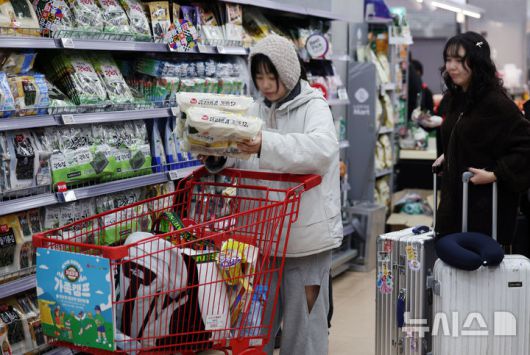 [서울=뉴시스] 김진아 기자 = 서울 시내의 한 대형마트에서 외국인 관광객들이 김을 구매하고 있다. 2025.11.24. bluesoda@newsis.com |