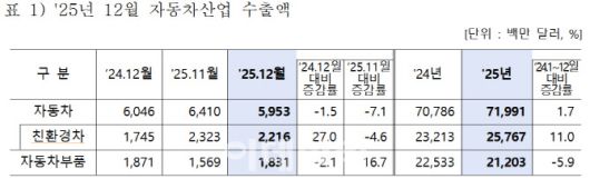 15일 산업통상부가 발표한 ‘2025년 및 12월 자동차 산업 동향’에 따르면, 지난해 자동차 수출은 720억 달러를 기록하며 3년 연속 700억 달러를 돌파했다. 2023년 709억달러를 넘어선 역대 자동차 수출액 최고 기록이다.