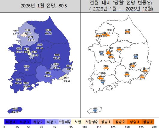비수도권은 광역시를 중심으로 회복 조짐을 보였다. 광역시는 10.5p 상승한 88.9로 전망됐고 도 지역은 0.6p 오른 68.7로 집계됐다. 부산은 22.9p 급등했으며 대구·대전·울산·세종도 상승했다. 반면 경북과 충남, 전남, 제주 등은 하락세를 보였다.