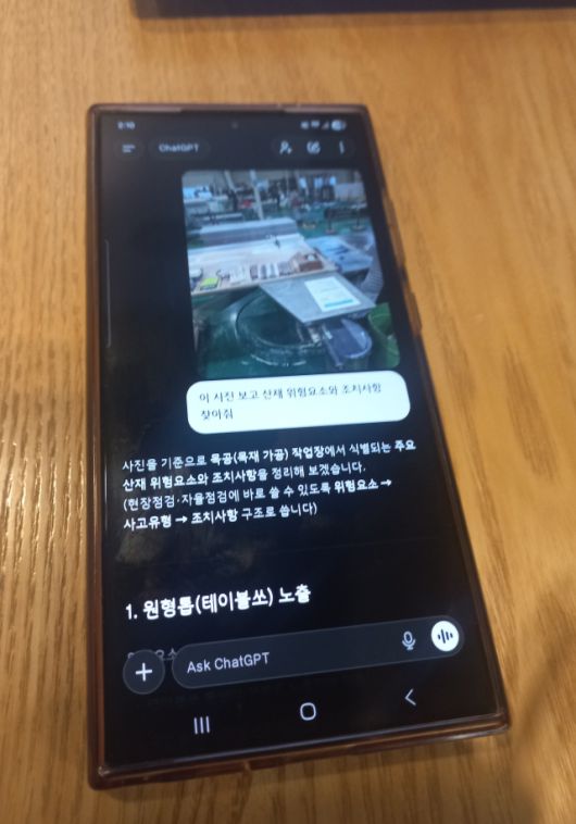 하지만 챗GPT에 이 사진을 입력하고 ‘산재 위험 요소를 찾아달라’고 요청하자, 챗GPT 답변은 예상과 달랐다. 3초도 안 돼 작업장 위 ‘원형톱날 노출’이 위험 요소로 지적됐다. 이 톱날이 손가락 절단 사고를 일으킬 수 있다는 점이 경고됐다. 챗GPT는 톱날 상부에 덮개를 달고 절단 작업 때 작업자 손을 보호하는 ‘푸시 스틱(push stick)’ 장치를 반드시 사용하라고 조언했다. 톱날 교체 때 전원 차단 장치와 작업 시 반동을 줄이는 장치도 필요하다고 제안했다. 박 서기관은 “생성AI 등장이 만든 산재예방의 변화”라며 “국민 스스로 자신의 일터에 어떤 위험이 숨어있는지 너무 쉽게 알 수 있게 됐다”고 말했다.