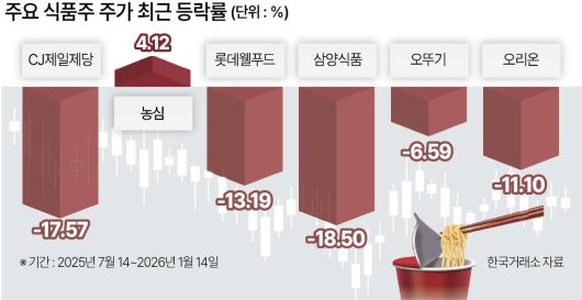 지난해 초만 해도 식품주는 유망했던 섹터 중 하나였다. 도널드 트럼프 미국 대통령의 고강도 관세 정책의 무풍지대로도 꼽혔다. 넷플릭스 오리지널 콘텐츠인 ‘케이팝 데몬 헌터스(케데헌)’ 등 K-콘텐츠 인기도 기대감을 키웠다.