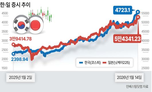 최근 일본도 한국과 유사한 흐름이다. 이날 인베스팅닷컴에 따르면 14일 일본 대표 주가지수 닛케이225 평균주가(닛케이지수)는 전일 대비 1.48% 오른 5만4341에 거래를 마쳤다. 사상 처음 5만4000선을 돌파했다. 이틀 연속 사상 최고치 행진이다. 최근 3개월 상승률은 15.98%에 달한다.