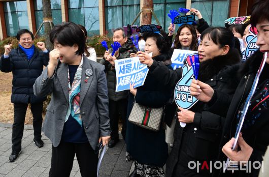 아시아투데이 이병화 기자 = 서영교 더불어민주당 의원이 15일 국회 소통관에서 서울시장 출마 선언 기자회견을 하기 위해 이동하며 지지자들의 응원에 눈물을 훔치고 있다.