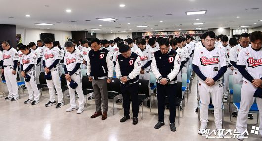 (엑스포츠뉴스 잠실, 박지영 기자) 15일 오전 서울 송파구 잠실야구장에서 열린 '2026 두산 베어스 창단 기념식'에 참석한 선수단이 故 김민재 코치의 명복을 빌며 추모 묵념을 하고 있다.박지영 기자 jypark@xportsnews.com