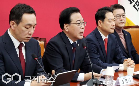 (서울=국제뉴스) 송언석 국민의힘 원내대표가 15일 오전 서울 여의도 국회에서 열린 최고위원회의에서 발언을 하고 있다./사진=이용우 기자