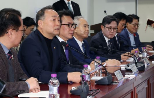 ▲더불어민주당 김원이 의원(왼쪽 두 번째)이 14일 국회 의원회관에서 열린 김민석 총리와 광주·전남 통합추진 특위 간담회에서 발언하고 있다. ⓒ연합뉴스 |