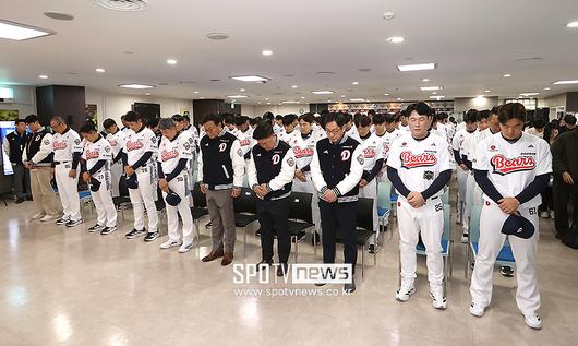 [스포티비뉴스=잠실, 곽혜미 기자] 2026 두산 창단기념식이 15일 오전 서울 송파구 잠실야구장에서 열렸다. 두산 감독 및 선수단이 고 김민재 코치 추모 묵념을 하고 있다. <저작권자 ⓒ SPOTV NEWS. 무단전재 및 재배포 금지>