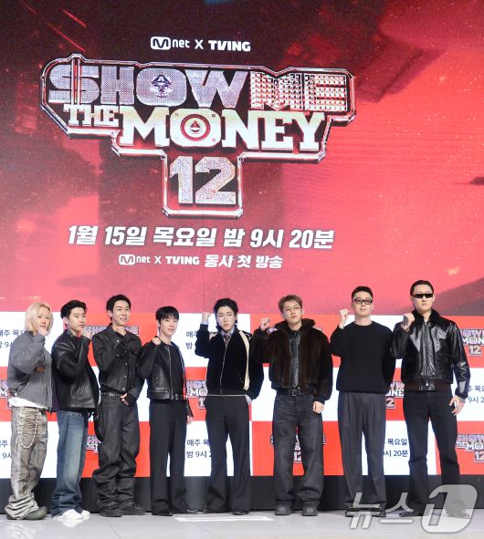 (서울=뉴스1) 권현진 기자 = 가수 겸 프로듀서 릴 모쉬핏(왼쪽부터)과 박재범, 로꼬, 그레이, 지코, 크러쉬, 허키 시바세키, 제이통이 15일 오전 서울 강남구 엘리에나호텔에서 열린 Mnet ‘쇼미더머니12’ 제작발표회에 참석해 포즈를 취하고 있다. 2026.1.15/뉴스1