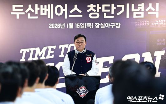 (엑스포츠뉴스 잠실, 박지영 기자) 15일 오전 서울 송파구 잠실야구장에서 열린 '2026 두산 베어스 창단 기념식'에 참석한 고영섭 대표이사가 인사하고 있다.박지영 기자 jypark@xportsnews.com