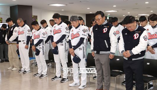 [스포티비뉴스=잠실, 곽혜미 기자] 2026 두산 창단기념식이 15일 오전 서울 송파구 잠실야구장에서 열렸다. 두산 감독 및 선수단이 고 김민재 코치에 대한 추모 묵념을 하고 있다. <저작권자 ⓒ SPOTV NEWS. 무단전재 및 재배포 금지>