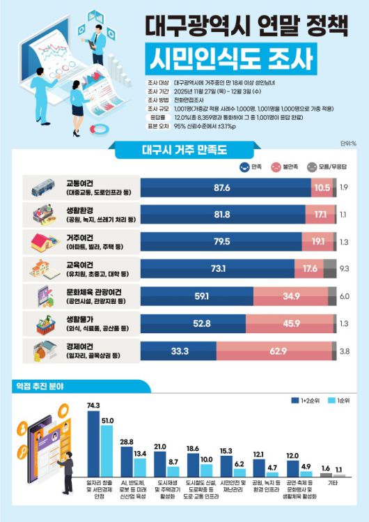 먼저, 대구시 거주 만족도와 관련해 교통, 교육, 생활물가, 거주여건, 경제여건, 문화체육관광 여건, 생활환경 등 시민 삶의 질과 관련된 7개 분야 만족도를 조사한 결과, 교통여건(87.6%), 생활환경(81.8%), 거주여건(79.5%) 등은 높은 만족도를 보였다. 반면 경제여건은 불만족 비율이 62.9%로, 조사 항목 중 유일하게 부정응답이 많았다.