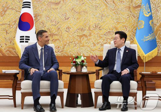 (서울=뉴스1) 허경 기자 = 이재명 대통령이 15일 청와대 본관에서 칼둔 칼리파 알 무바라크 아랍에미리트(UAE) 아부다비 행정청장을 접견하고 있다. 2026.1.15/뉴스12expulsion@news1.krCopyright ⓒ 뉴스1. All rights reserved. 무단 전재 및 재배포, AI학습 이용 금지.