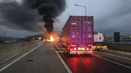 당시 가드레일을 들이받고 중앙분리대를 재차 충격해 멈춰 선 트레일러에 불이 났다.