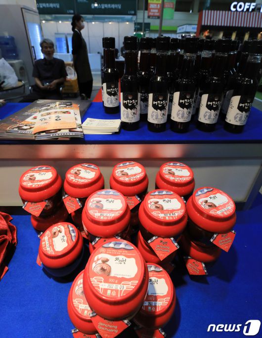 6일 서울 강남구 코엑스에서 열린 '제6회 대한민국 발효·식초대전 2020'에 할랄식품 인증 받은 고추장과 간장 등이 진열돼 있다. 2020.8.6/뉴스1 ⓒ News1 구윤성 기자 |